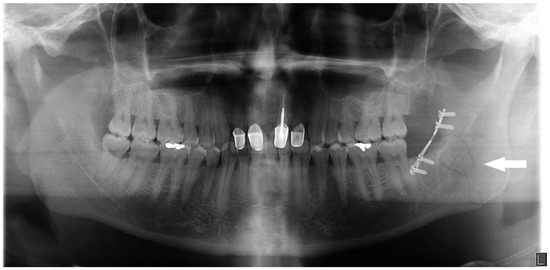 Postoperative orthopanorex showing fixation of the left angle fracture with a 2.0 Champy plate.
