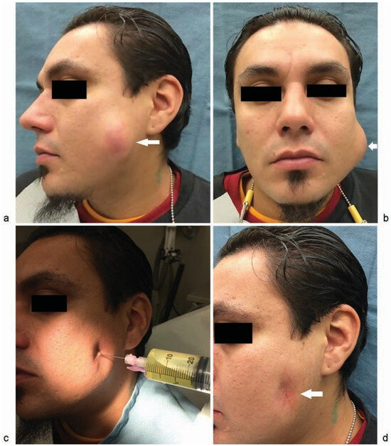 (a–d) Fluctuant left facial mass 5 weeks post-op. Aspiration of 20 mL of fluid from the mass. (d) Post-aspiration.