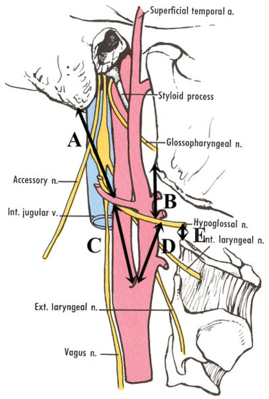 - Kim, T.; Chung, S.; Lanzino, G. Carotid artery-hypoglossal nerve relationships in the neck: An anatomical work. Neurol Res 2009, 31, 895–899. [Google Scholar] [CrossRef] [PubMed]