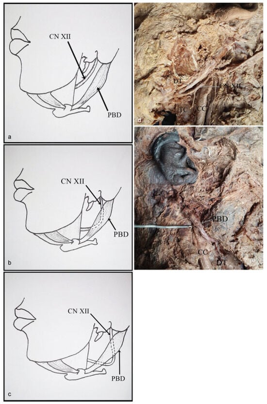 Relation of the CN XII loop to the digastric tendon. (a) CN XII loop superior to the digastric tendon. (b) CN XII loop at the same level as the digastric tendon. (c). CN XII loop inferior to the digastric tendon. (d) Dissected cadaveric specimen on the left side showing the CN XII nerve looping below the digastric tendon (DT). (e) Dissected cadaveric specimen on the right side showing the CN XII nerve (probed) coursing along the posterior belly of digastric muscle (PBD) to lie at the same level as the DT. CC, common carotid artery; TC, thyroid cartilage.