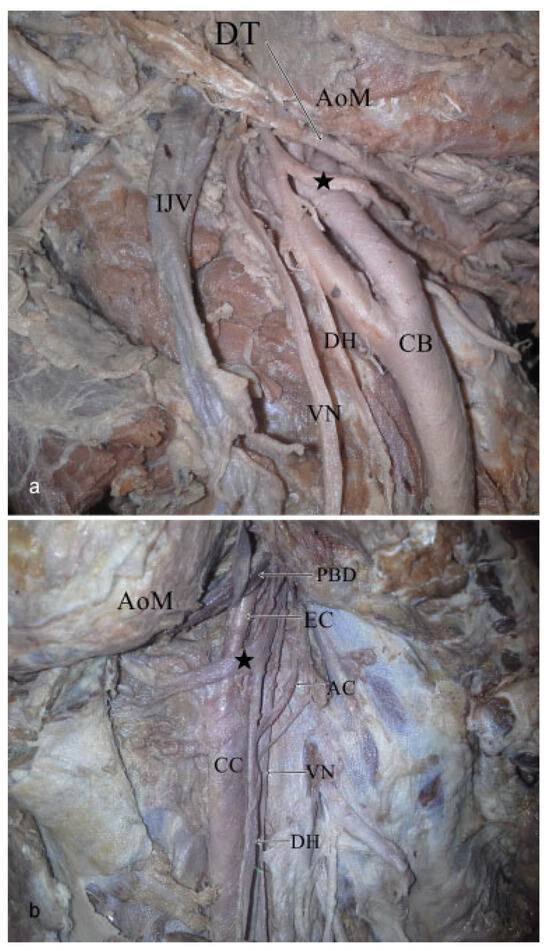 Relation of the CN XII loop to the carotid bifurcation. (a) Dissected cadaveric specimen on the right side showing the CN XII nerve (star) forming a high loop by crossing high above the carotid bifurcation (CB). The loop is also below the digastric tendon (DT). (b) Dissected cadaveric specimen on the left side showing the CN XII nerve (star) coursing on the carotid bifurcation. The CN XII loop is also below the posterior belly of digastric muscle (PBD). AC, ansa cervicalis; AoM, angle of mandible; CC, common carotid artery; ECA, external carotid artery; IJV, internal jugular vein; DH, descendens hypoglossi; VN, vagus nerve.