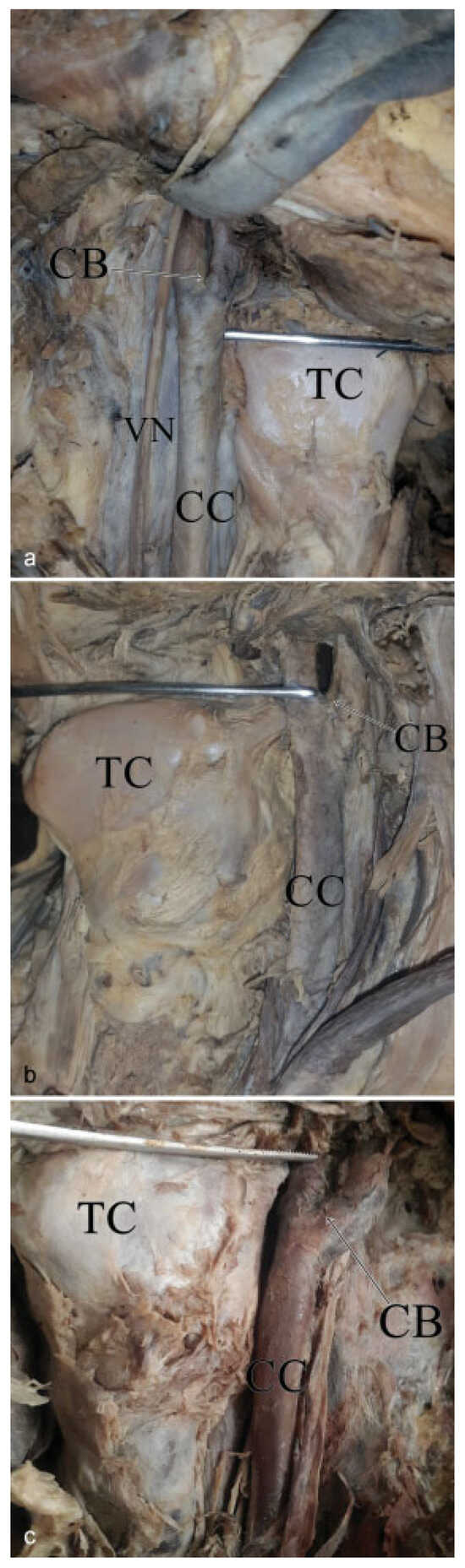 Types of common carotid artery (CCA) bifurcation. (a) Dissected cadaveric specimen on the right side showing a high level (type I) of carotid bifurcation (CB). The upper boarder of the thyroid cartilage (probed) is below the level of the level of bifurcation. (b) Dissected cadaveric specimen on the left side showing the carotid bifurcation (CB) at the same level (type II) as the upper boarder of the thyroid cartilage (TC). (c) Dissected cadaveric specimen on the left side showing the carotid bifurcation (CB) positioned lower (type III) than the upper boarder of the thyroid cartilage (TC).