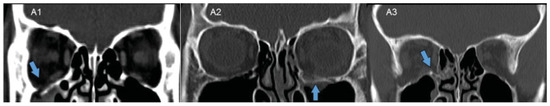 Fracture extent assessed and classified into three groups—A1: floor lateral to infraorbital canal; A2: floor medial to infraorbital canal; A3: involving the inferomedial strut. The fracture site is represented by the blue arrows.