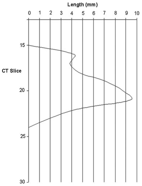 Table 1 shows an example of orbital floor fracture measurement in a patient (patient 12). Figure 3 shows the 2D diagram of orbital fracture measurement (patient 12). Orbital floor area quantification was as described earlier, with the anterior border determined as the first CT slice with a visible maxillary sinus, and posterior border at the apex of the orbit.