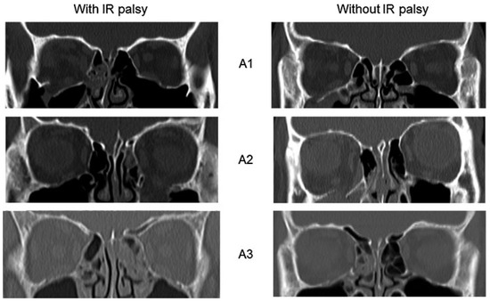 Patients with and without inferior rectus (IR) palsy, each group having fracture type A1, A2, and A3.