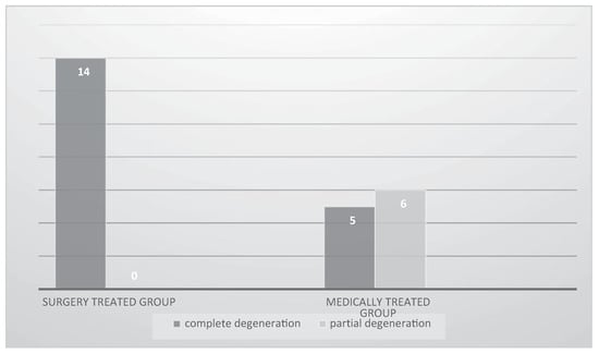 Patients were precisely evaluated through audiological evaluation, including air-bone conduction pure-tone audiometry, tympanometry, and stapedial reflex measurement[20,21,22] (Table 1). ENoG demonstrated more than 90% degeneration (complete degeneration) for 19 patients (79%) (Figure 1). House–Brackmann (HB) grading system which is commonly used to assess facial nerve function for patients were applied to evaluate the outcomes after either decompression surgery or conservative therapy.[23] To make a better judgment in comparing pretreatment versus posttreatment outcomes, facial nerve function was classified into three subgroups: HB grades I and II were representing normal nerve function, grades III and IV were considered as partial palsy, and grades V and VI were representing complete palsy.