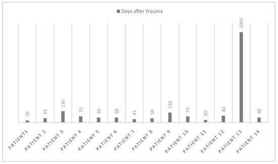 The exact time of surgery among patients operated within the first 2 months following trauma.