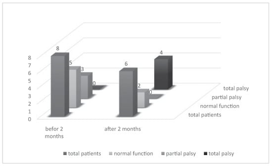 Of the 25 patients in the study, 16 (64%) patients demonstrated normal facial nerve function after the treatment, 4 (16%) indicated partial palsy, and 5 (24%) encountered complete palsy, which is a catastrophic event.