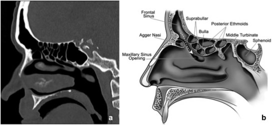 (a) CT in the sagittal plane of the frontal sinus outflow tract (FSOT). (b) Corresponding illustration of the frontal sinus outflow tract (dotted arrow) bordered anteriorly by the agger nasi cell and posteriorly by the suprabullar and bullar cells.
