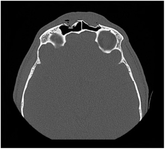 CT in the axial plane demonstrating a comminuted, displaced bilateral fracture of the anterior table of the frontal sinus fracture. In the acute setting, significant soft tissue edema may obscure a palpable deformity.