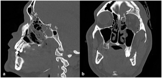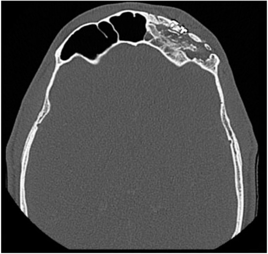 - Gonty, A.A.; Marciani, R.D.; Adornato, D.C. Management of frontal sinus fractures: A review of 33 cases. J Oral Maxillofac Surg 1999, 57, 372–379. Available online: http://www.ncbi.nlm.nih.gov/pubmed/10199487 (accessed on 29 May 2018).