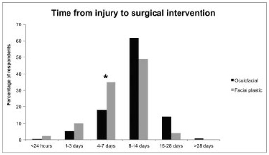The most common preferred time from injury to surgical intervention was 8 to 14 days for both oculofacial and facial plastic surgeons (61.7 vs. 48.8%; Figure 1). The difference in preferred time to operation between the two groups was significant overall (p < 0.001) and in particular at the time range of 4 to 7 days after injury (34.9% facial plastics vs. 18.0% oculofacial surgeons, p < 0.001).