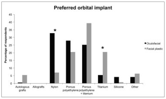 Preferred choice of implant material for orbital floor fracture repair for oculofacial and facial plastic surgeons. * Responses with statistically significant differences (p < 0.0026).
