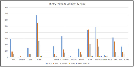 To further elucidate whether race and insurance status were associated with fracture location and mechanism of injury, the frequencies of injuries and anatomic fracture location within racial subsets were calculated. Interestingly, black and Hispanic patients have a higher likelihood of being physically assaulted (55% and 51%, respectively) compared to white patients (42%), and a higher likelihood of angular fractures (45% and 41%, respectively) compared to white patients (27%) (