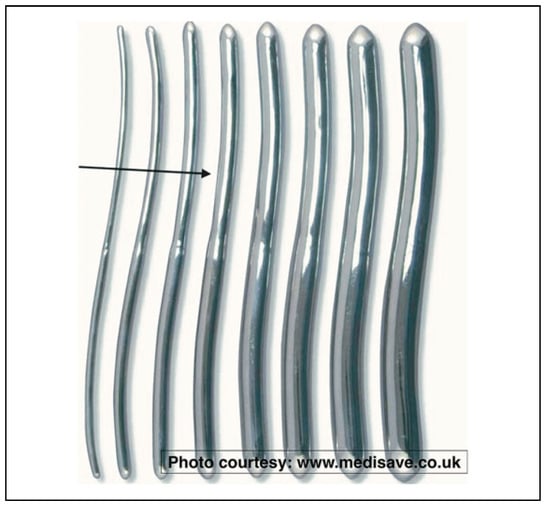 Uterine dilator used for open reduction of isolated zygomatic arch fracture. An arrow is pointing to a medium-sized dilator, which is recommended by the senior author S.Z. (Photo courtesy: www.medisave.co.uk).