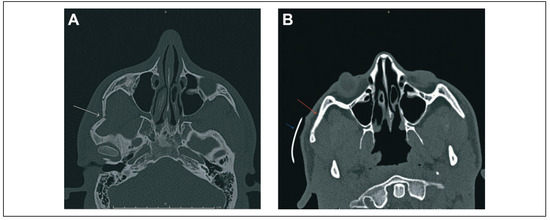 Preoperative (A) and postoperative (B) appearance of the right zygomatic arch on computed tomography scans (white arrow—right zygomatic arch fracture prior to treatment; red arrow—right zygomatic arch status-post open reduction external fixation; and blue arrow—external splint in place overlying the right zygoma).