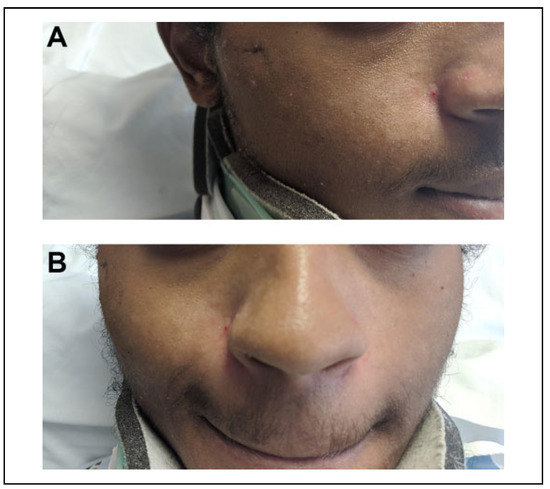 A 21-year-old African American male who sustained a right-sided, isolated zygomatic arch fracture as a result of an automobile versus pedestrian accident. On physical examination, he had a clear step-off deformity palpated over the right malar eminence, trismus with interincisor distance of 1.5 fingerbreadths, and paresthesia in the V2 distribution. The right zygomatic arch was noted to be severely comminuted and displaced on CT maxillofacial scan prior to repair (Figure 4A). Following open reduction external fixation as described earlier, a repeat maxillofacial CT scan was performed, which showed proper reduction of the right zygomatic arch (red arrow) prior to removal of the external fixation splint in proper position 3 weeks later (Figure 4B). At follow-up, the patient had marked improvement in malar contour appreciated on oblique (Figure 5A) and frontal (Figure 5B) views. The patient had minimal skin changes overlying the splinted area, and there was complete resolution of his paresthesia and trismus.