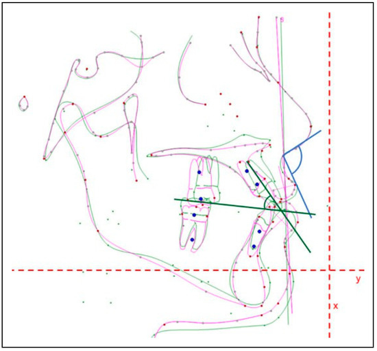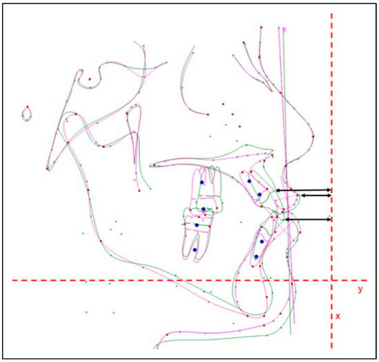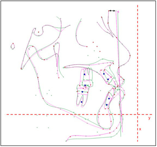 After marking the points, the “superimpose” tool was used to overlap the predictive traced images, created in the “treatment simulation”, with the 1-year postoperative images. This overlap was performed using the sella and soft glabella points as reference.