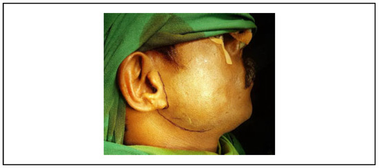 In our patients with condyle fracture, a small parotid incision directly over the fracture site provided the direct access needed for ORIF which allowed easy placement of the titanium plate. In addition, titanium screws can be placed perpendicular to the bone surface. Satisfactory postoperative healing was recorded (Figure 8). Minimal swelling was noted and postoperative pain management was with simple analgesics. The design of skin incision to expose the parotid capsule as explained earlier was in shape of “Lazy S.” Skin incision length/release depended on the facial type of patient, that is, thin face versus fat face. With the parotid capsule incision, the fracture site can be reached directly. No massive soft tissue dissection was needed. Periosteal dissection is limited; it provided sufficient blood supply to the fracture site during surgery. The facial nerve is safely placed within the parotid tissue. In 1 case, we visualized the nerve; it was successfully retracted and saved.