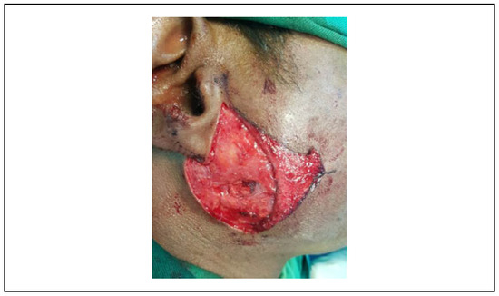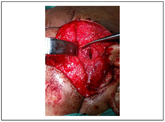 A longitudinal incision was made along the skin on the surface of the mandibular condylar neck and was extended beyond the earlobe according to the degree of skin laxity to release the tension (Figure 2). After initial incision, the skin was released from the underlying tissue in a plane superficial to the parotid capsule (Figure 3). The parotid capsule was incised parallel to the facial nerve branch axis (transverse/horizontal incision on parotid capsule) (Figure 4). Blunt dissection using a heavy hemostat in perpendicular direction directly to the ramus was carried out between the trunks of buccal and zygomatic branches of facial nerve. Blunt dissection was carried out by opening of the beaks of the hemostat perpendicular to the long axis of the facial nerve branches and no closure of hemostat was done when within the tissue to avoid injury to vital structures to expose the fascia masseterica. Once beyond the masseter muscle, cautery with low intensity was used to incise the muscle and periosteum, and the fracture site was exposed. This allowed for direct vision with adequate exposure. There will be no bleeding or major vessel encountered in this region. The proximal part of the mandibular ramus was pulled down to obtain reduction of the condylar head. Two 4-hole mini-titanium plates were applied to the fracture site of the mandibular condylar neck for rigid fixation (Figure 5). The occlusal relationship was checked. Surgical drains were never placed. Layered suture closure was carried out. Watertight closure of the parotid fascia was strictly followed.