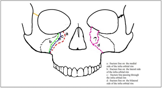 Figure 1. Line diagram showing clinical patterns of possible different fracture lines in relation to infraorbital foramen in zygomaticomaxillary complex fractures.