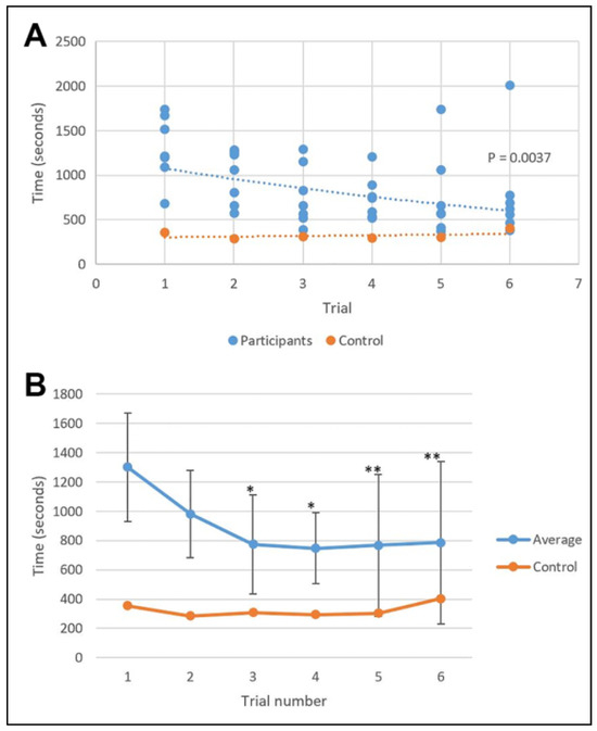 A, Exponential fitted regression analysis demonstrated a downward trend in the planning time with subsequent trials. Control: y = 298.04e0.0224x. Participants: y = 1204.2e−0.114x. R2 = 0.1925. P = .0037. B, The novice users’ average planning times approached a proficient user’s planning times (control). *Within 2 standard deviations; **within 1 standard deviation.