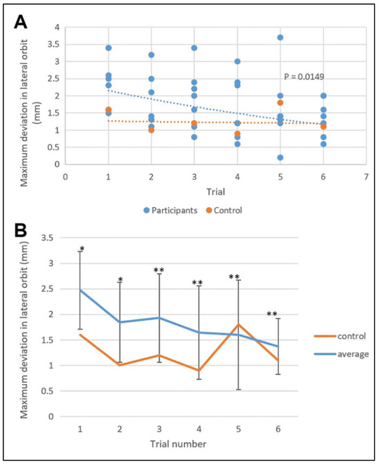 A, A scatter plot and exponential fitted regression analysis showed improvement in the maximum deviation in the lateral orbit in preoperative plans for orbital fractures with successive trials. Control: y = 1.2774e0.011x. Participants: y = 2.4626e−0.127x. R2 = 0.1393. P = .0149. B, There was no significant difference in the novice users’ average maximum deviation in the lateral orbit compared to the proficient user’s measurements for all the trials. *Within 2 standard deviations; **within 1 standard deviation.