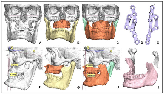 - Gander, T.; Bredell, M.; Eliades, T.; Rücker, M.; Essig, H. Spintless orthognatic surgery: a novel technique using patient-specific implants (PSI). J Craniomaxillofac Surg. 2016, 43, 319–322. [Google Scholar]