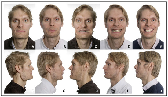 Clinical pictures before treatment and after retention period. Clinical pictures before treatment (A), (C), (F), and (H) and after 1.5-year follow-up (B), (D), (G), and (I) demonstrate that facial symmetry was obtained. Clinical pictures after completing prosthodontic treatment, 2.5 years (E and J).