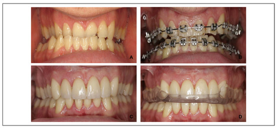Occlusion before, during, and after treatment. Front view. The occlusion at the beginning of the treatment (A). The occlusion before the bimaxillary surgery (B). The occlusion after crown lengthening process and laminate crowns (C and D).