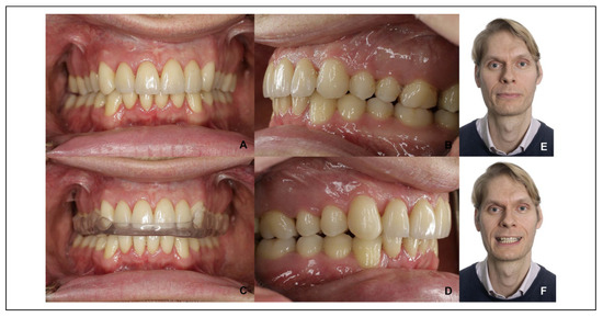 Postsurgical occlusion after retention period, crown lengthening process, and prosthodontic treatment. Front view (A and C), left (B), and right side (D). Profile picture after retention period, crown lengthening process, and prosthodontic treatment (E and F).