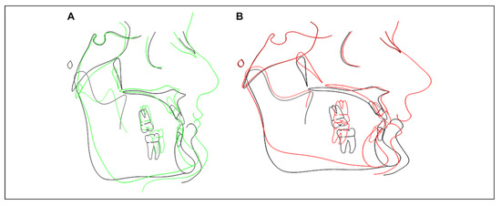 (A) Cephalometric superimpositions. Cephalometric superimposition at the beginning (presented in green) and preoperatively (presented in black). (B) Equally, superimpositions preoperatively (presented in black) and at the end of active orthodontic treatment (presented in red).