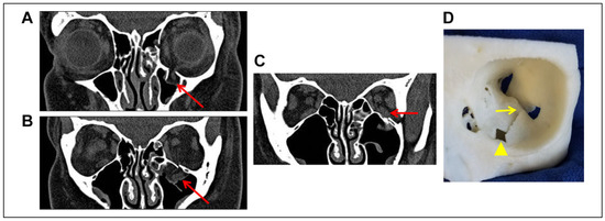 - Soll, D.B.; Polley, B.J. Trapdor variety of the blowout fracture of the orbital floor. Am J Ophthalmology. 1965, 60, 269–272. [Google Scholar] [CrossRef]