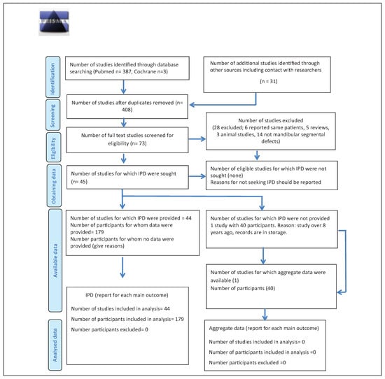 Screening and eligibility assessment was performed by the first author (V.V.K.) who is a maxillofacial reconstructive surgeon. Individual Patient Data from eligible patients was extracted from each publication to the extent it was available. Whenever no IPD was available, the respective author was contacted per mail, requesting the missing information. Duplicate patient details were identified by comparing recruitment dates/treatment time/time frame during which patients were treated, comparing defect and reconstruction characteristics of the described patients and similarity in the author/institution details.
