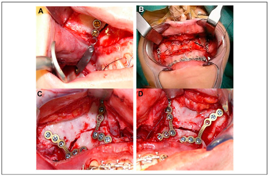 A, The temporary ramus fixation cranial of the LeFort I osteotomy. B, The monobloc of maxilla and mandible moved cranial until the holes of the ramus fixation plates are in position of the predrilled screw holes again. C and D, The definitive osteosynthesis of the maxilla on each side.