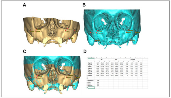 The analysis of the registration accuracy using the alignment tool in ProPlan CMF software. A and B, Four reproducible landmarks spread over each zygoma (superior, inferior, lateral, and anterior) were defined and marked in the preoperative and corresponding in the postoperative data set. C, The registration of the segmented pre- and postoperative data sets. D, The registration accuracy was evaluated by comparison of the preoperative and postoperative positions of the 4 zygoma landmarks and the calculation of the difference in all 3 axes X/Y/Z.