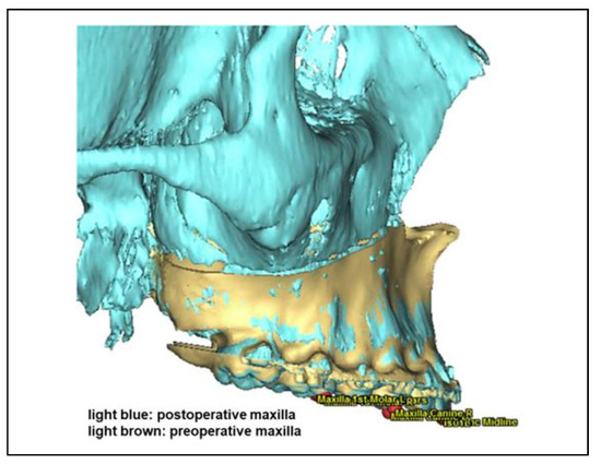 - Heufelder, M.; Wilde, F.; Pietzka, S.; et al. Clinical accuracy of waferless maxillary positioning using customized surgical guides and patient specific osteosynthesis in bimaxillary orthognathic surgery. J Craniomaxillofac Surg. 2017, 45, 1578–1585. [Google Scholar] [CrossRef]