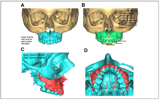 A, The preoperative maxilla with the virtual osteotomies corresponding to the separated cast model. B, The landmarks on the split maxilla before movement of the maxilla. C and D, The preoperative position (blue) and the postoperative position (red) of the split maxilla.