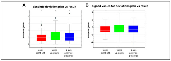 A, The absolute deviations between preoperative plan and postoperative result with regard to the X/Y/Z axes calculated for all 35 cases and all 5 different landmarks. B, The signed values.
