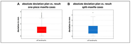 A, The absolute deviation of all one-piece maxilla cases regarding all landmarks. B, The corresponding deviation of the split-maxilla cases.