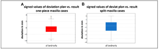 A, The signed values of deviation of all one-piece maxilla cases regarding all landmarks. B, The corresponding deviation of the spli-maxilla cases.