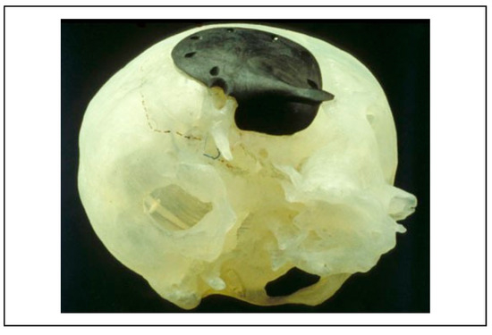 - Rasse, M.; Lindner, A. Reconstruction of calvarial defects with prefabricated carbon fibre implants. J Craniomaxillofac Surg. 1996, 24, 92. [Google Scholar] [CrossRef]