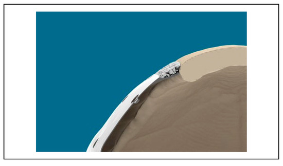 The central titanium portion of the CeTi acts as a crumple zone protecting the brain from traumatic impact (mechanical integrity) by absorbing energy, and is not prone to breakage, as may occur with CAD-CAM HA shells from Custom Bone Service (Fin-Ceramica). Because the shell is thin except at its rim, it allows for easy implantation on an expanded brain (Figure 3). The screw fixation pulls the implant into place, and the peripheral scaffolding can accommodate HydroSet (Stryker), an injectable bone substitute that acts as a Ca/P depot, facilitating biological integration. Once the implant has been perimetrically osseointegrated, the neurocranium regains its original helmet function. A traumatic impact will not result in additional stress accumulation at the screw fixation and, consequently, will not cause strain at the bony margin with outfracturing into the brain.