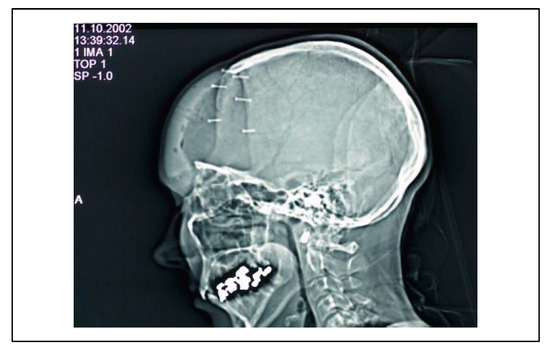 - Chandler, C.L.; Uttley, D.; Archer, D.J.; MacVikar, D. Imaging after titanium cranioplasty. Br J Neurosurg. 1994, 8, 409–414. [Google Scholar] [PubMed]