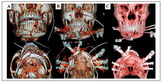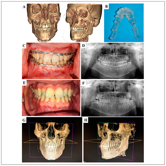 - Wang, H.D.; Frost, C.; Cusano, A.; Dorafshar, A.H. Management of bilateral edentulous mandible fractures through an intraoral approach using CAD/CAM technology: a case report. J Oral Maxillofac Surg. 2018, 76, e1–e1056. [Google Scholar]