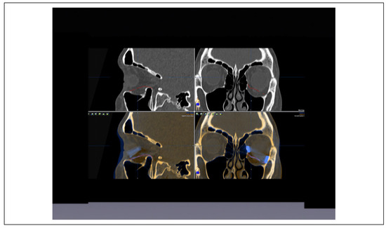 - Baumann, A.; Sinko, K.; Dorner, G. Late reconstruction of the orbit with patient-specific implants using computer-aided planning and navigation. J Oral Maxillofac Surg 2015, 73 Suppl. S12, S101–106. [Google Scholar] [CrossRef]