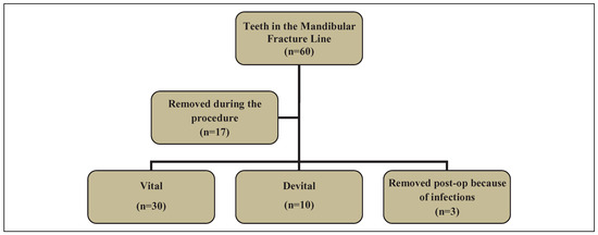 - Samson, J.; John, R.; Jayakumar, S. Teeth in the line of fracture: to retain or remove? Craniomaxillofac Trauma Reconstr. 2010, 3, 177–184. [Google Scholar] [CrossRef] [PubMed]