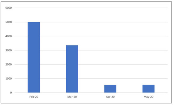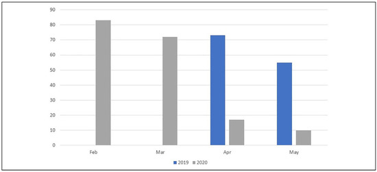 The operations’ count for laryngeal and/or oropharyngeal neoplasm surgeries was 83 and showed gradual drop by 13% in March. Yet, 76% plunge was noted in April where surgeries reached 17. The overall drop from the start of February to the end of May was 88% where only 10 cases received surgical care. The major drop of surgeries in April and May were compared to the same period of the previous year to rule out any seasonal variations and to propose what the numbers would have been if conditions had been normal. This comparison elucidated 79% drop of surgical care in this period, from 128 cases in 2019 to 27 cases in 2020.