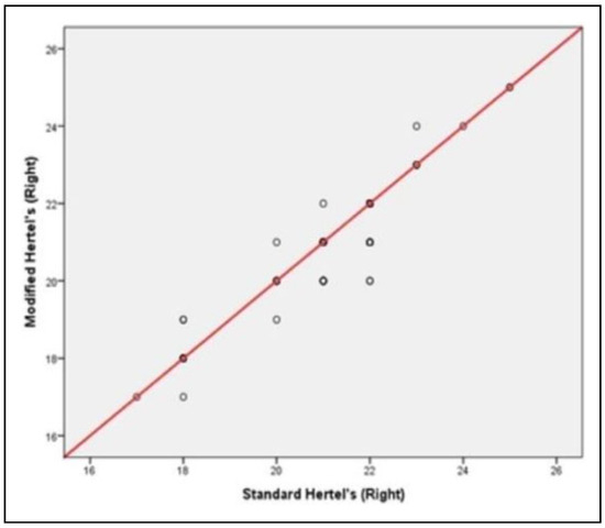 The scatterplot showing correlation between standard and modified Hertel instrument is presented in