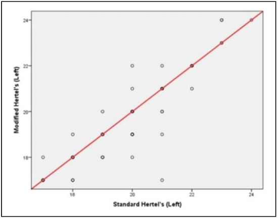 This shows a largely positive correlation between these 2 values. The positive correlation shows that when the values of standard Hertel exophthalmometer increase, the values in modified Hertel exophthalmometer will also increase.